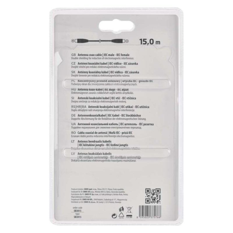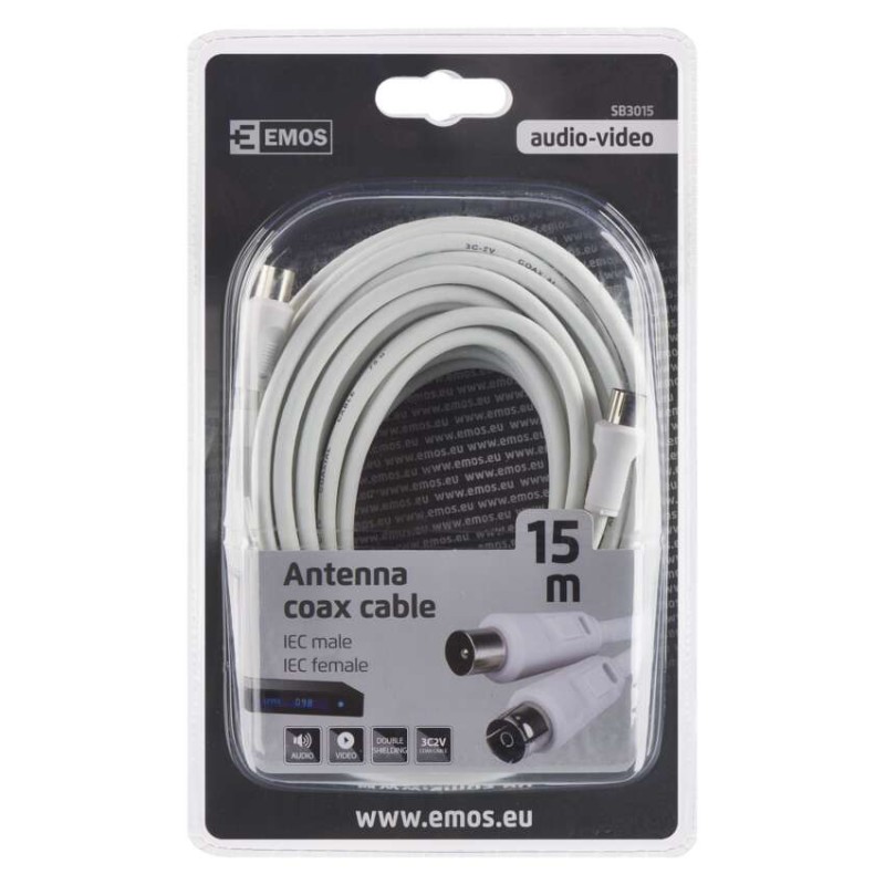 Antenní koaxiální kabel s IEC vidlicí a zásuvkou. Kabel má dvojité stínění pro snížení elektromagnetického rušení. Délka kabelu je 15 m. Koaxiální kabel je vhodný pro SAT, DVB-T, ANT, DECODER, FLAT TV a TV.