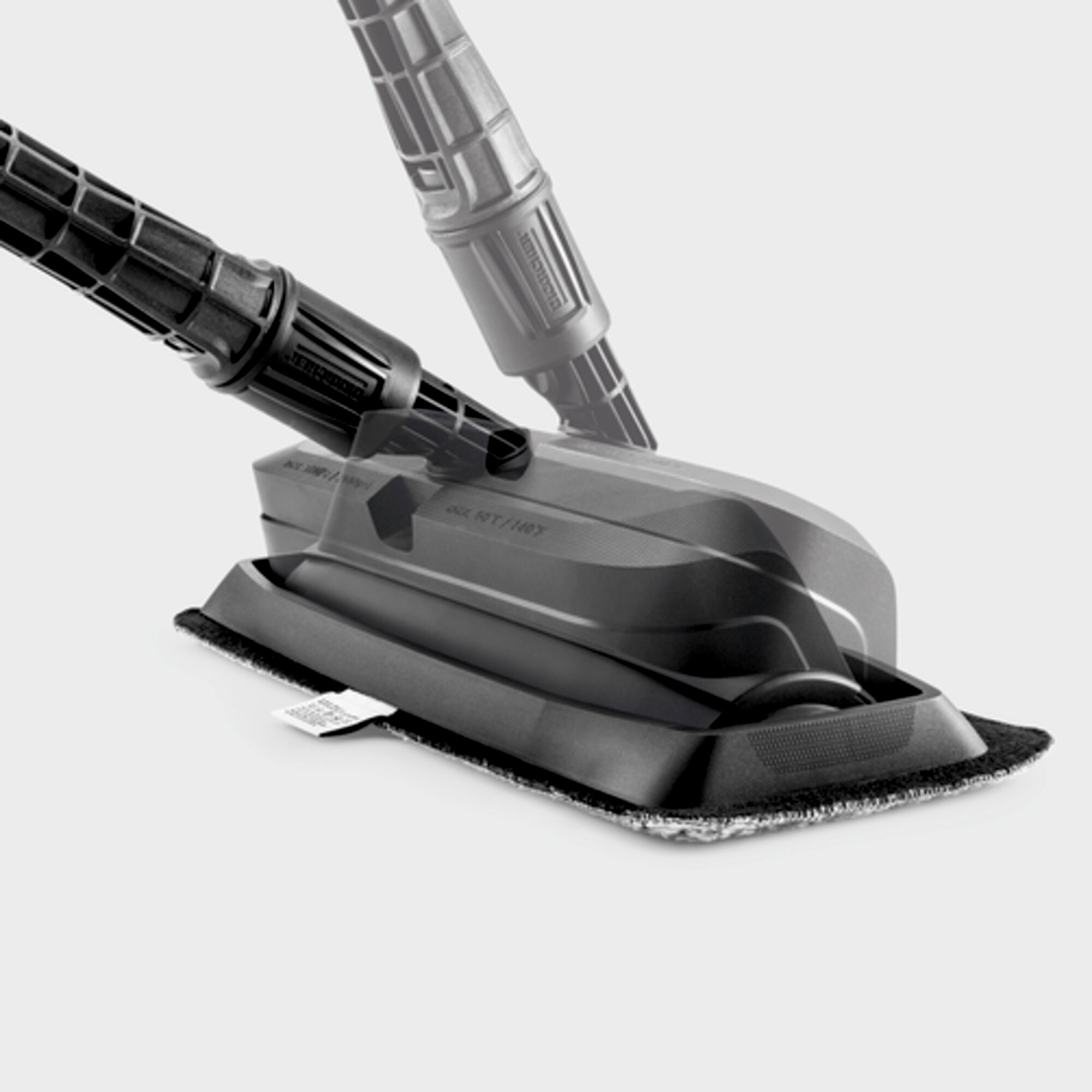 Rovnomerné a vysoko efektívne čistenie: štyri vysokotlakové trysky eliminujú odolné nečistoty na rôznych povrchoch. V závislosti od použitia je možné vymeniteľný rám ľahko a rýchlo vymeniť. Rám so štetinami na čistenie fasád a stien chráni používateľa pred striekajúcou vodou a dá sa s ním tiež jemne pohybovať po povrchu. Na čistenie sklenených povrchov, napríklad zimných záhrad, sa dokonale hodí rám s podložkou z mikrovlákna, ktorý je pripevnený suchým zipsom. Abrazívne vlákna podporujú odstraňovanie nečistôt a zaručujú jemné čistenie povrchov.