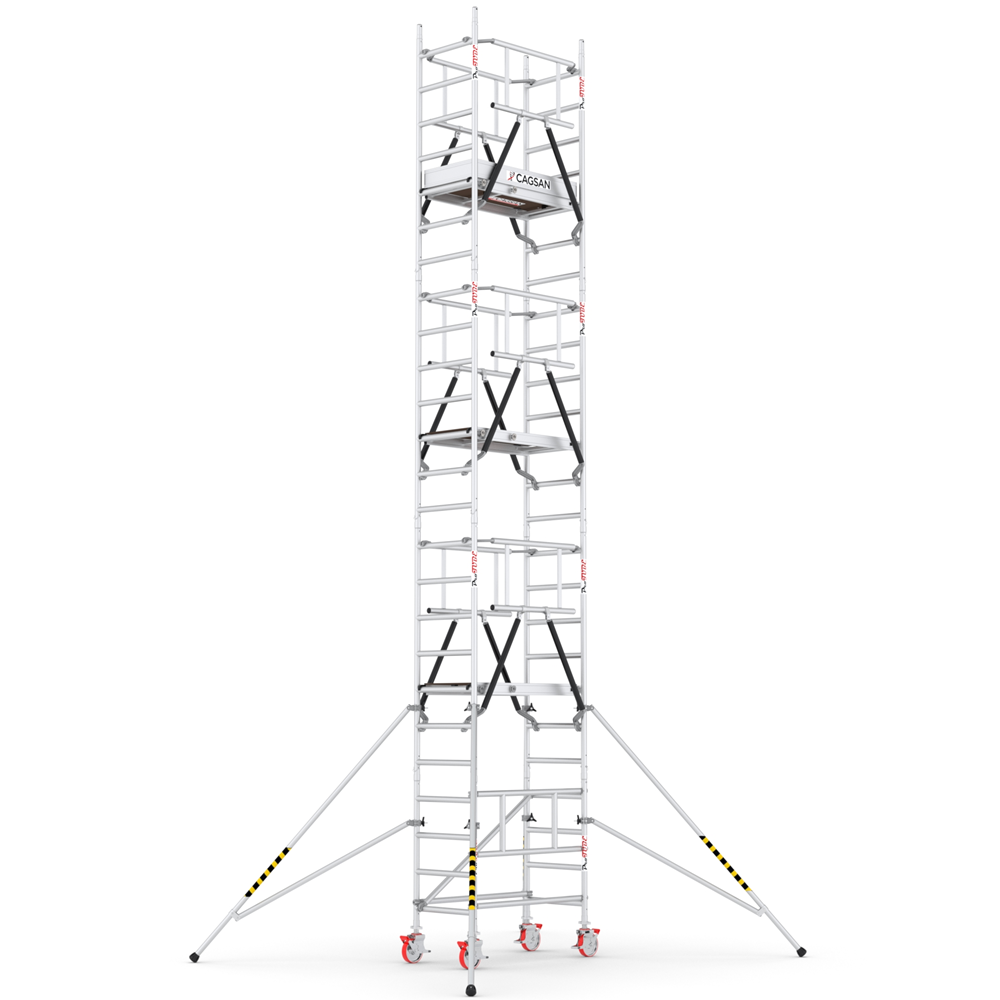Profesionálne hliníkové lešenie umožňuje nastavenie lešenia do pracovnej výšky max 6,50 m. Jednoduchý a rýchly zaisťovací systém. Ponúka vďaka vynovenému dizajnu ešte bezpečnejšiu možnosť pri inštalácií a používaní. PROTUBE Solo vám pomôže zefektívniť vašu práciu vďaka jednoduchému použitiu, bezpečnostným opatreniam a odolnej konštrukcii. Špeciálne zliatinové brzdené kolieska. Hmotnosť lešenia 171 kg.