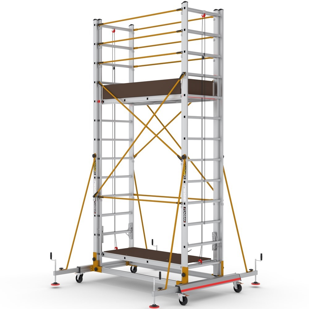 Profesionálne, ľahko prestaviteľné dvojdielne teleskopické hliníkové lešenie ovládané lanami, ktoré umožňujú nastavenie lešenia do pracovnej výšky do 7,23 m. Na obsluhu lešenia stačia 2 osoby. TeleSafe ponúka flexibilitu použitia vďaka špeciálnemu kĺbovému systému a nastaviteľnej dĺžke. Pevná hliníková konštrukcia a oceľové podpery tvoria bezpečnú a odolnú konštrukciu.Pre rýchlu inštaláciu lešenia sa používa systém upínania Q-Lock. Výšku plošiny a lešenia je možné jednoducho nastaviť vďaka lanovému a kladkovému systému. Kryty plošiny a zábradlia sa otvárajú z vnútra, čím vytvárajú bezpečné pracovné prostredie. Má praktickú a prenosnú konštrukciu pre mobylné použitie.Uzamykateľné kolieska a oceľové podpery minimalizujú možné otrasy. Video ukážku lešenia TeleSafe XLN nájdete na tomto odkaze: https://www.youtube.com/watch?v=csk4mvdAOLg