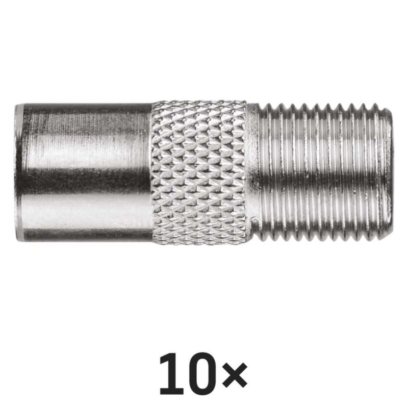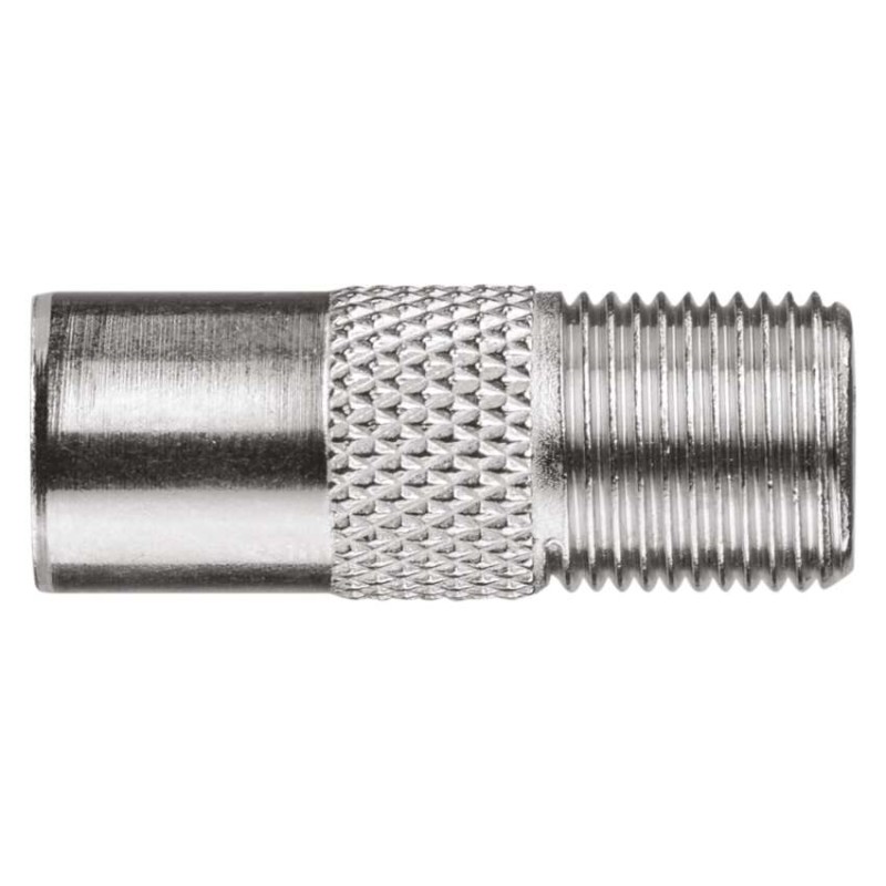Zásuvka F s vidlicí IEC M5850. Redukce je určena pro připojení ke koaxiálnímu kabelu.