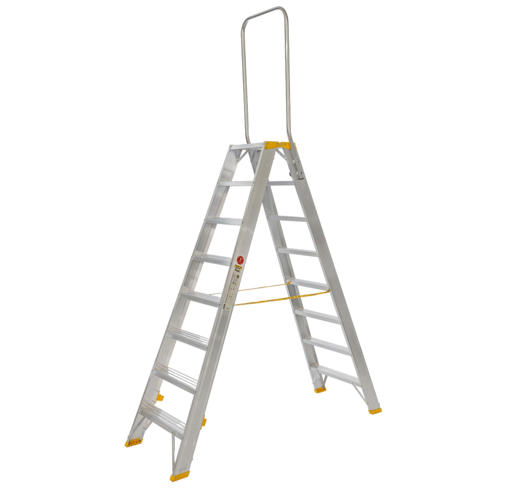 Obojstranné hliníkové schodíky so sklápateľným madlom FORTE, počet nášľapov 2 x 8, výška 1,70 m a šírka 546 mm. Možnosť použitia na profesionálne účely. Na produkt sa vzťahuje záruka 7 rokov.