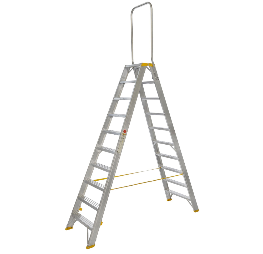 Obojstranné hliníkové schodíky so sklápateľným madlom FORTE, počet nášľapov 2 x 10, výška 2,12 m a šírka 594 mm. Možnosť použitia na profesionálne účely. Na produkt sa vzťahuje záruka 7 rokov.