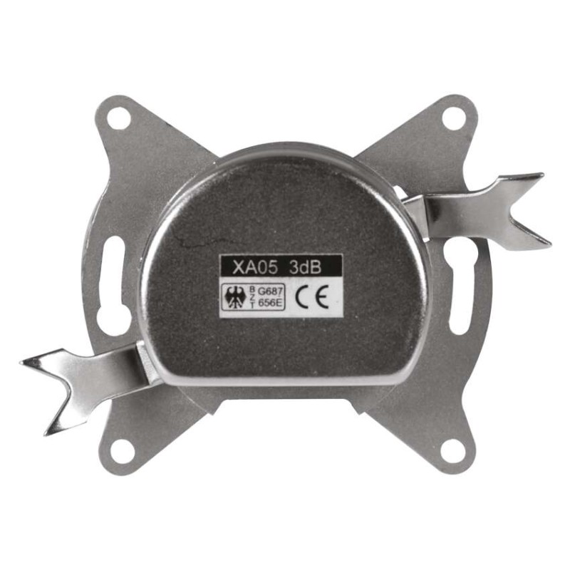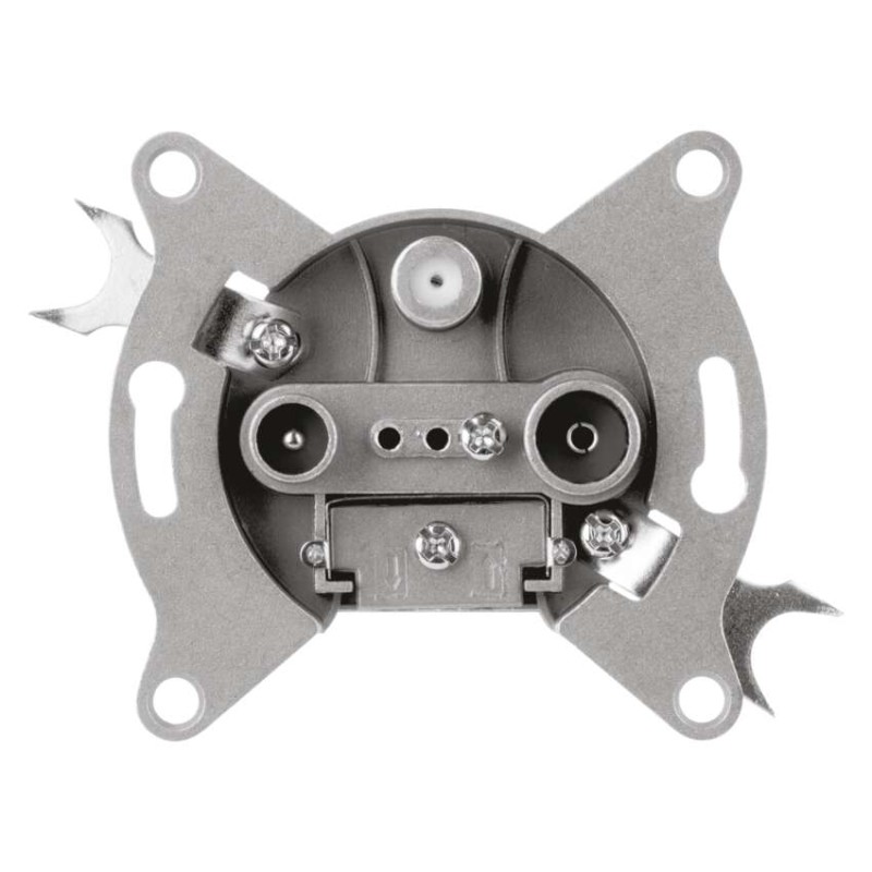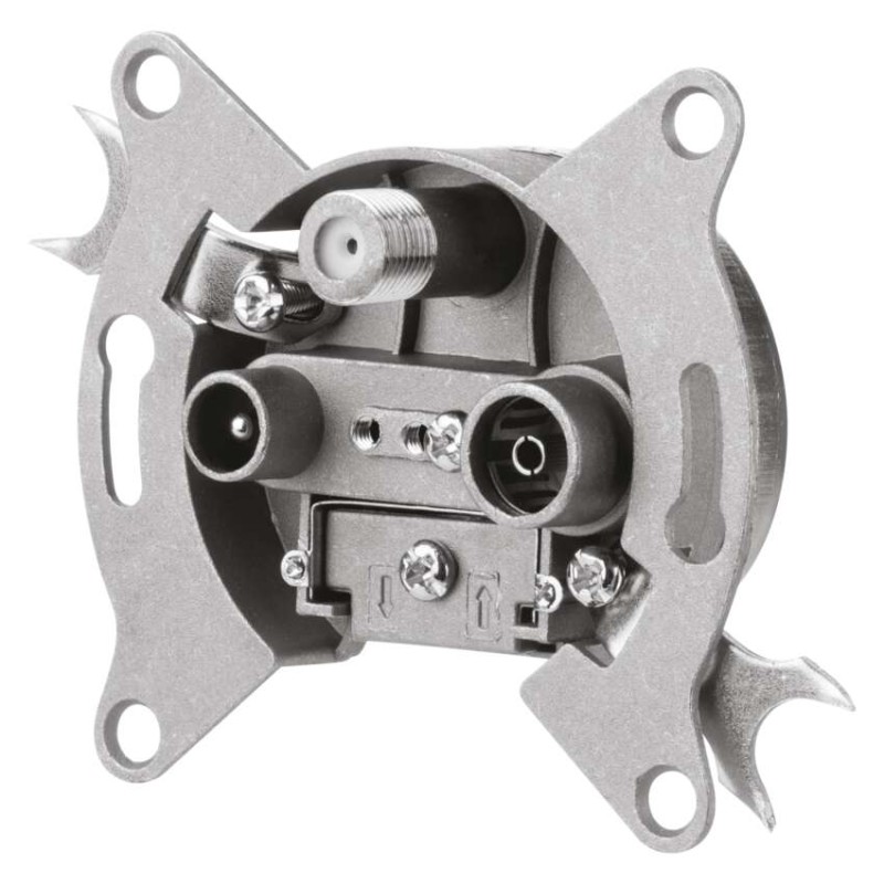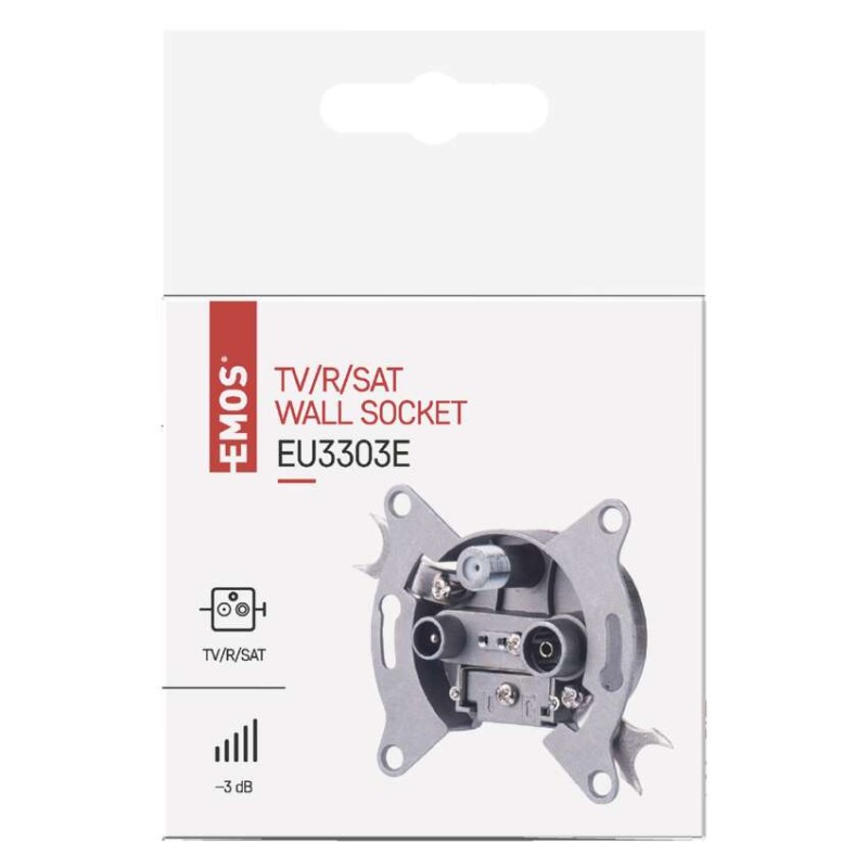 Absolventní zásuvka EU 3303 satelitní koncová zásuvka s útlumem 3 dB a zásuvkami pro TV + Radio + SAT. Abonentní zásuvka propojuje např. anténu s TV, satelitem nebo set-top-boxem. Zásuvka SAT je průchozí pro stejnosměrné napětí a lze ji použít i pro průchod napájení předzesilovače v pozemní anténě.